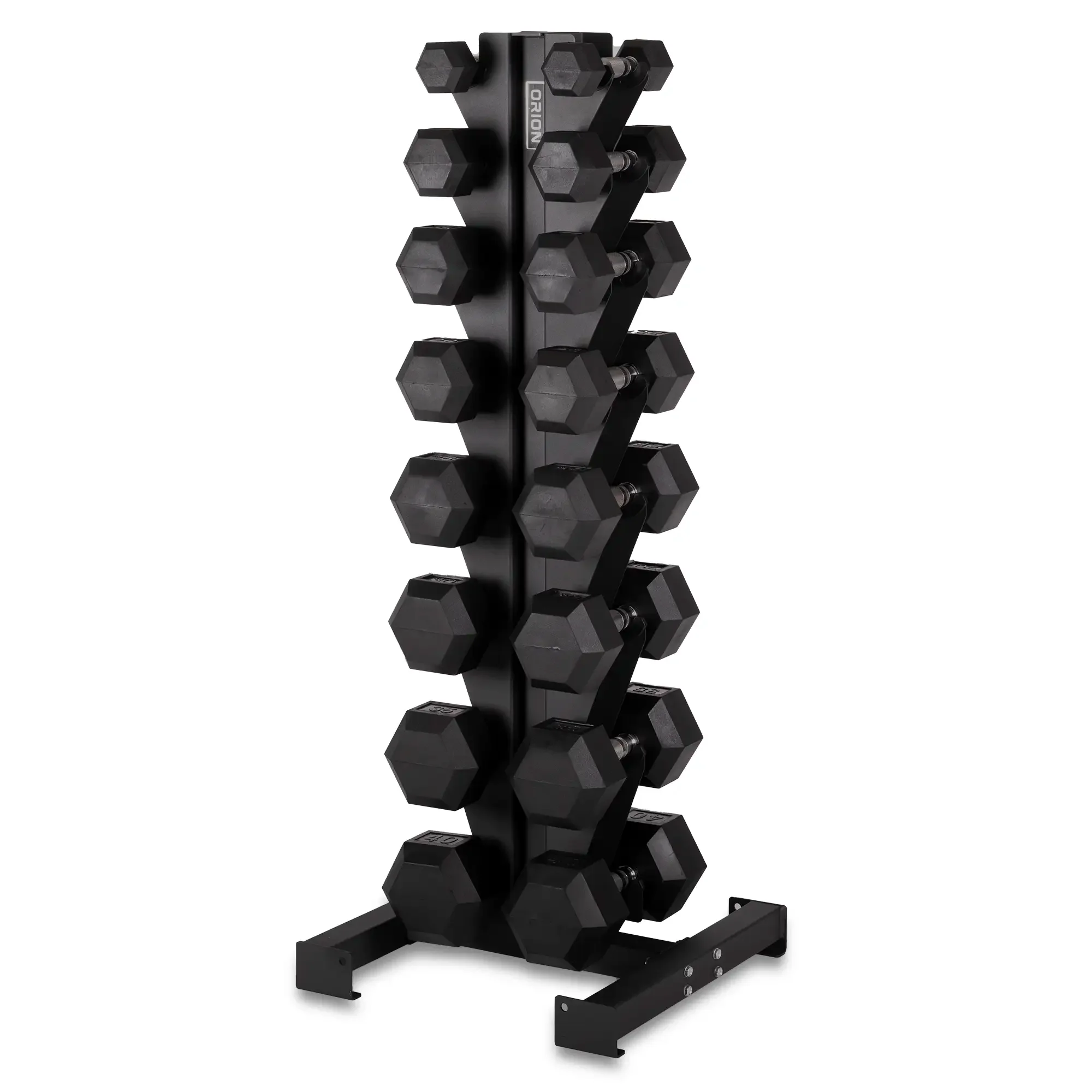 This set includes a pair of 5, 10, 15, 20, 25, 30, 35 and 40 LB dumbbells. A vertical dumbbell rack for 8 pairs of dumbbells is included. Made of heavy gauge steel in a space-efficient design, this rack is great for any sized space.